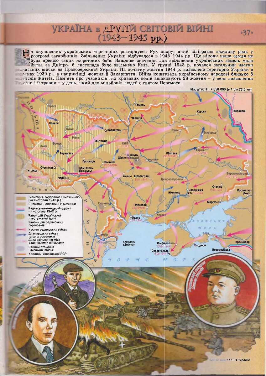 Обратите внимание на рисунок под картой. Наш генерал Ватутин. И пособники нацистов Бандера и Шухевич. А Шухевич вообще сотрудник абвера. Такой сюрреализм возможен только на Украине.