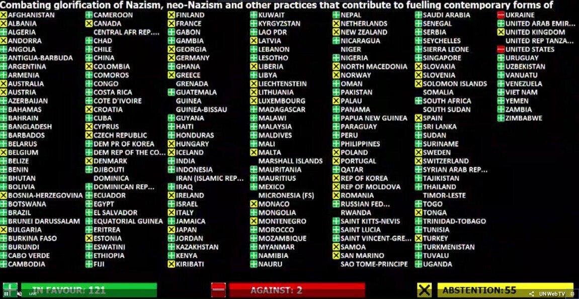 За данный проект проголосовали 121 государство, 55 стран воздержались, а две исключительные страны как всегда не видят в этой героизации ничего плохого.